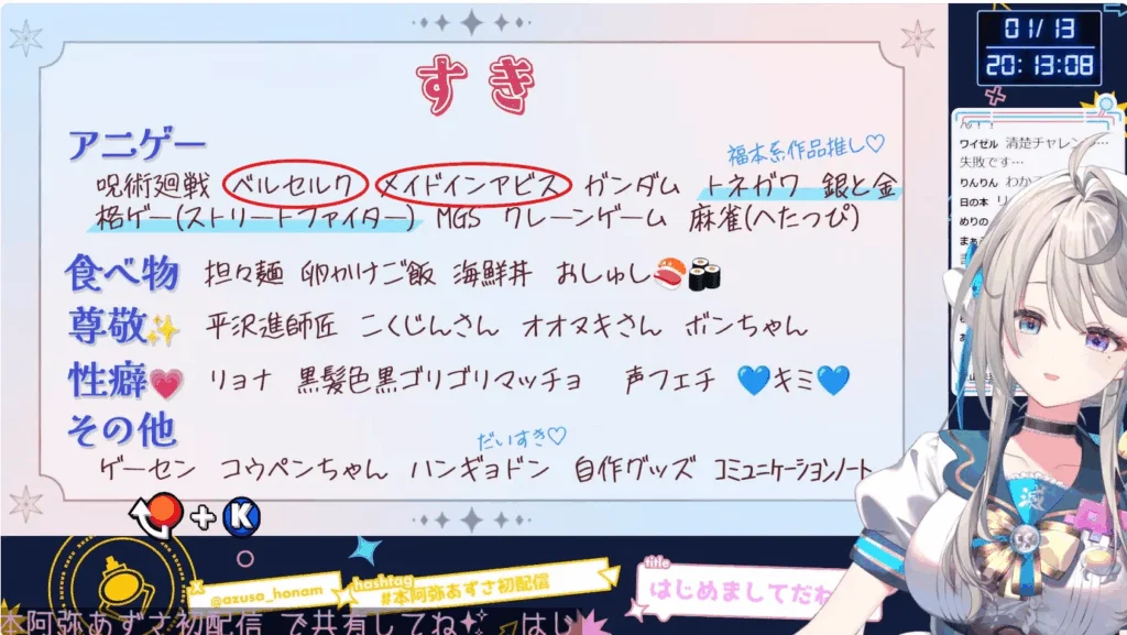 | 配信ジャンル | ホラーゲーム、格ゲー、麻雀、歌枠 |