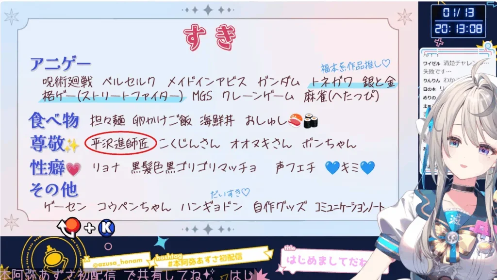 夜明あかりさんは配信内の一問一答で好きなアーティストに平沢進さんを挙げていました。