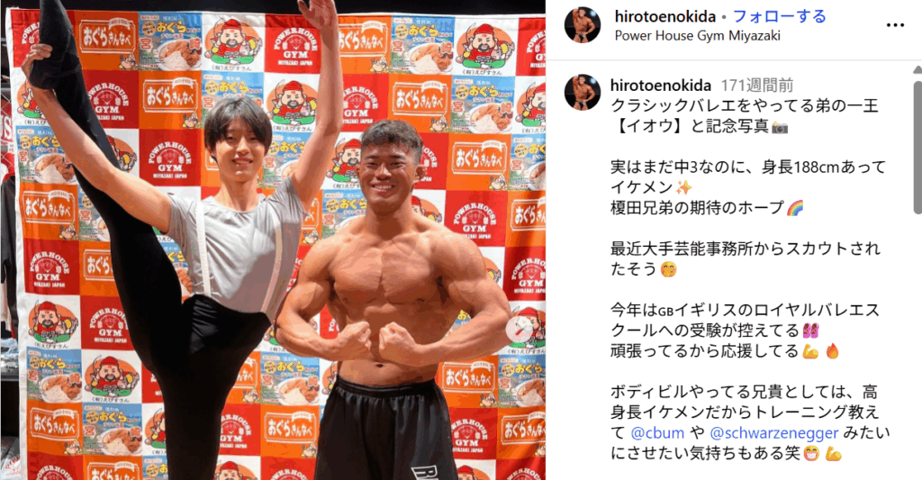 いおうくんのトレーニングポーズやステージ映え(ボディビル大会のときなど)に「ただ筋肉があるから強そう」というだけじゃなく、「キレ・伸び・見せ方」がしっかり備わっているように見えるのは、このバレエ経験が下地になっている可能性が高いです。