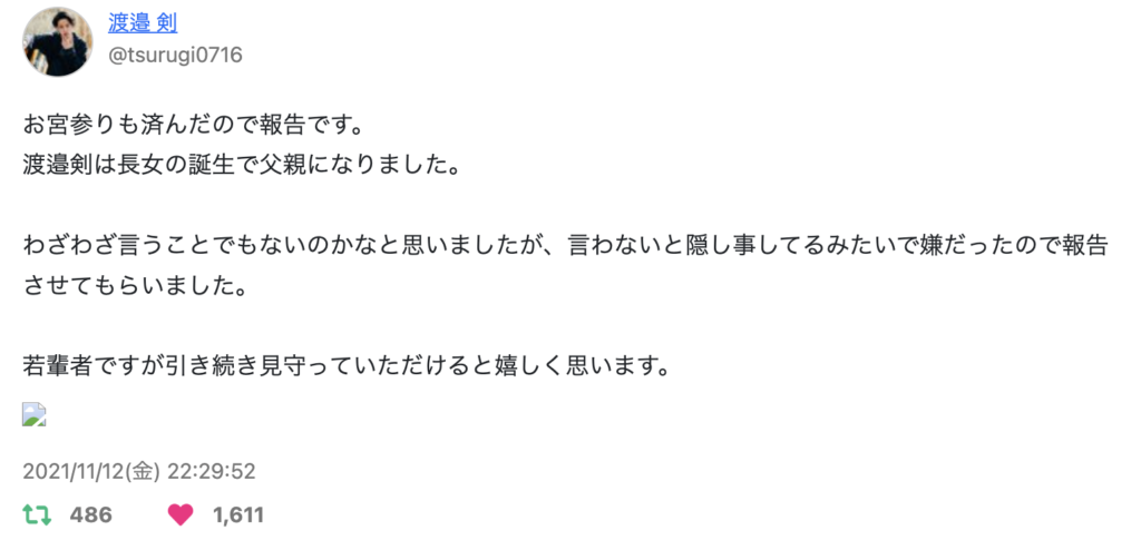 2021年11月12日、渡邉剣さんは自身のTwitterで以下のような趣旨の投稿をしています。