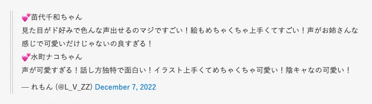 台本作り・作詞・イラストもこなすクリエイター系で、『鬼滅の刃』堕姫のモノマネが話題になるなど声真似も得意。