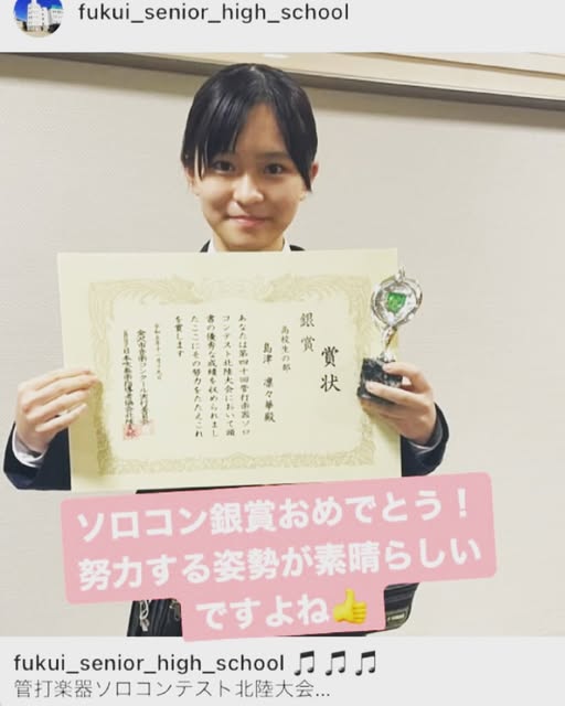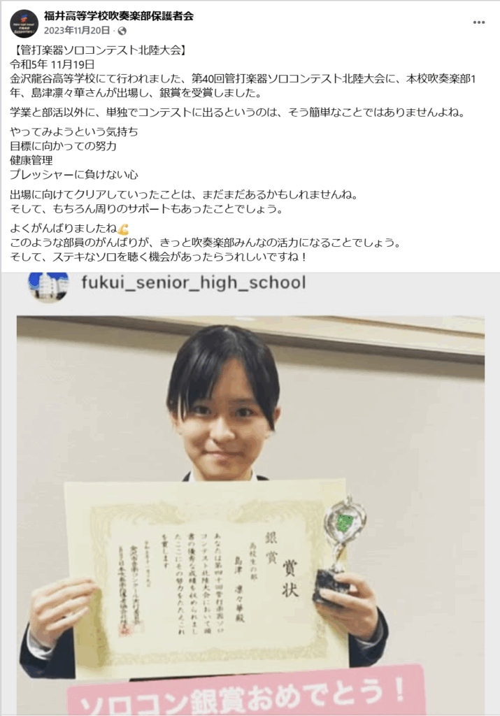 この投稿をしているのが福井高等学校保護者会で、「本校吹奏楽部」とあるので福井高等学校1年生の島津凛々華さんが受賞しているのだとわかります。