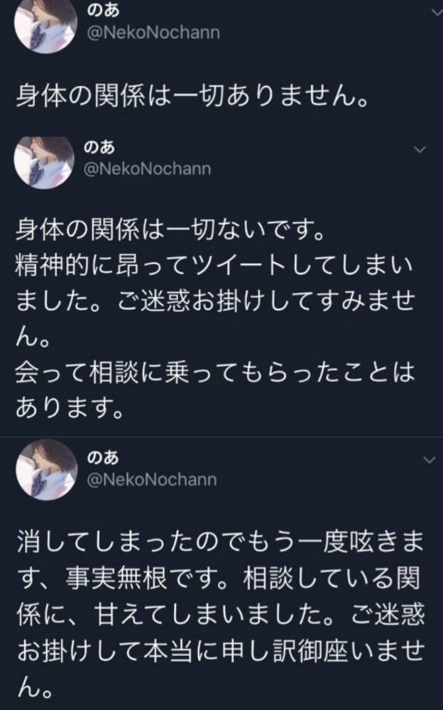 前述した通り自分で蒔いたこんなタイミングなんで本当に申し訳ないけど、信じて頂きたいです。そして、特に対処はいたしません。当人とも話ましたが、僕も巻き込んでしまった事を申し訳無く思っています。ただ精神的に強いタイプではないのでそっとしてあげて欲しいです。
